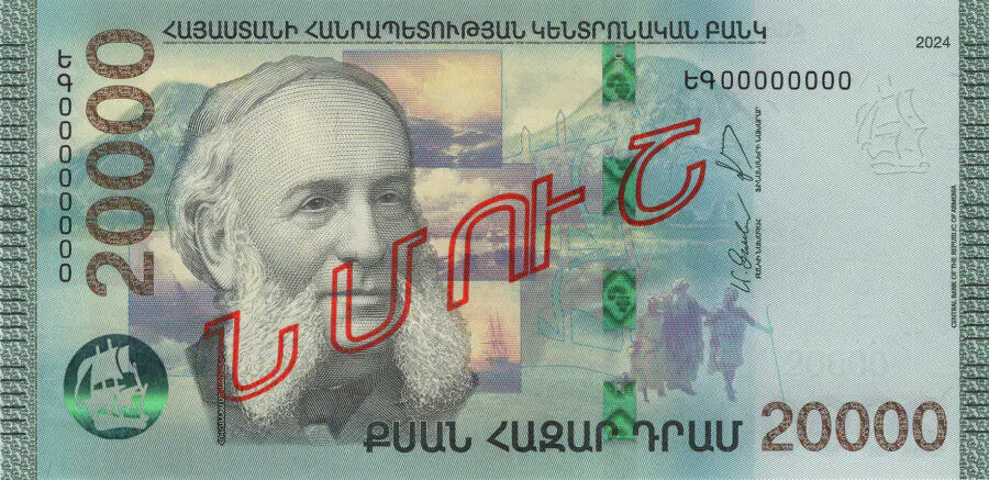 Ստորև ներկայացվում են 20000 դրամ անվանական արժեքով 2024 թ. թողարկման ՀՀ թղթադրամի նմուշը և վերջինիս նկարագրությունը: