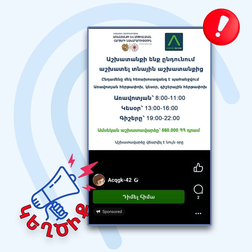 Հասարակություն Սոցցանցերում տարածվում է աշխատանքի ընդունման կեղծ հայտարարություն. ԱՍՀ նախարարությունը զգուշացնում է Published: 24 Մարտի, 2025 Կիսվել 0 Min Read ԿԻՍՎԵԼ ԱՍՀ նախարարությունից հայտնում են, որ սոցիալական ցանցերում տարածվում է աշխատանքի ընդունման կեղծ հայտարարություն, որում նշված է նաև ՀՀ աշխատանքի և սոցիալական հարցերի նախարարության անվանումը։ Բաժանորդագրվեք մեր ալիքին Telegram-ում Կարդացեք նաև 14 Հոկտեմբերի, 2025 Թվային արժույթների փոխարժեքները հոկտեմնբերի 14-ի դրությամբ 14 Հոկտեմբերի, 2025 Կրիպտոյով երիտասարդը կորցրեց 30 միլիոն դոլար 10 րոպեում 14 Հոկտեմբերի, 2025 Ռուսաստանը նոր պատժամիջոցների առջև է կանգնած. Reuters 14 Հոկտեմբերի, 2025 Իսրայելը վերջնագիր է ներկայացնում Եվրոպային Կիսվեք այս հոդվածով Facebook Pinterest LinkedIn Telegram Email Copy Link Print Պետերբուրգում կայանման վարձը կհասնի ժամում մինչև 360 ռուբլու 13 Հոկտեմբերի, 2025 Թռչող ավտոմեքենա Xpeng-ը ստացել է 7 հազար նախնական պատվեր 13 Հոկտեմբերի, 2025 «Վոլնորթը» պահանջում է փոխհատուցում. արբիտրաժային բողոք` ընդդեմ ՀՀ-ի` ԶՊՄԿ ներքին կորպորատիվ գործերին ապօրինի միջամտության հիմնավորումով 13 Հոկտեմբերի, 2025 Ոսկու գինը պատմության մեջ առաջին անգամ գերազանցել է $4100-ի սահմանը 13 Հոկտեմբերի, 2025 Ի վերջո, ո՞վ էր ճիշտ` Պուտինը, թե ՞ Փաշինյանը. Ռուսաստան-Հայաստան առևտրաշրջանառությունը. ԻՆՖՈԳՐԱՖԻԿԱ 11 Հոկտեմբերի, 2025 Գտեք մեզ սոց. ցանցերում Facebook Youtube Instagram Telegram-plane