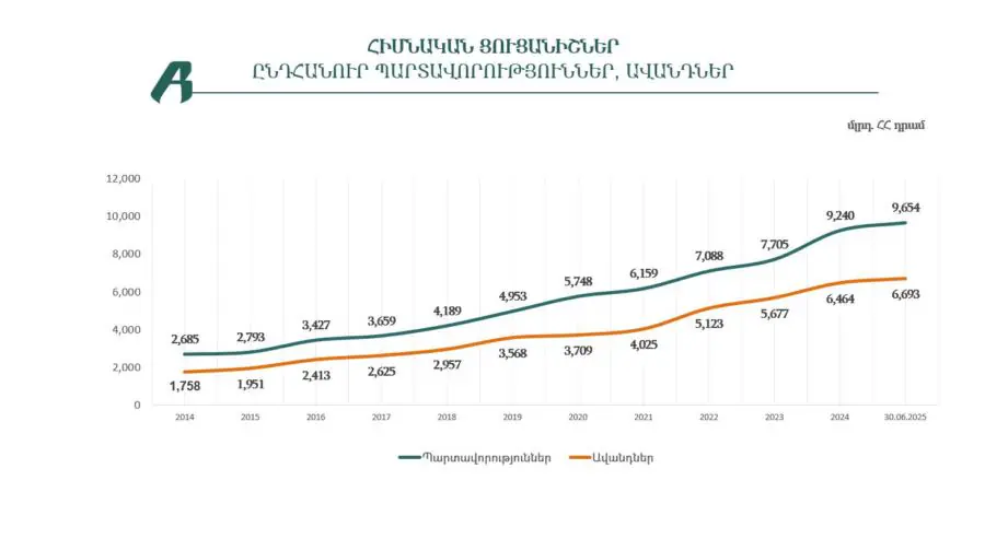 Ընդհանուր պարտավորություններն 2025թ-ի 1-ին կիսամյակում ավելացել են շուրջ 424 մլրդ ՀՀ դրամով կամ 4․6%-ով՝ կազմելով 9 654 մլրդ ՀՀ դրամ: