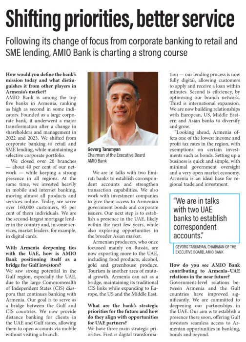 Ամիօ բանկի Վարչության նախագահ Գևորգ Թառումյանը հարցազրույց է տվել Արաբական Միացյալ Էմիրություններում լույս տեսնող անգլալեզու «Khaleej Times» թերթին՝ ներկայացնելով բանկի ռազմավարական առաջնահերթություններն ու միջազգային ծրագրերը։