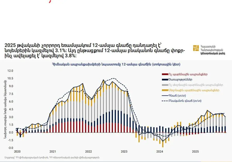 2025 թվականի չորրորդ եռամսյակում 12-ամսյա գնաճը դանդաղել է՝ նոյեմբերին կազմելով 3.1%: Այդ ընթացքում 12-ամսյա բնականոն գնաճը փոքր-ինչ ավելացել է՝ կազմելով 3.8%: