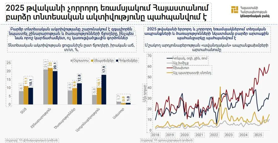 2025 թվականի չորրորդ եռամսյակում Հայաստանում բարձր տնտեսական ակտիվությունը պահպանվում է: Վերջինիս շարունակում են զգալիորեն նպաստել շինարարության և ծառայությունների ճյուղերը, ինչպես նաև որոշ կարճաժամկետ, ոչ կառուցվածքային գործոններ: 2025 թվականի երրորդ և չորրորդ եռամսյակներում տեղական ապրանքների և ծառայությունների նկատմամբ բարձր արտաքին պահանջարկը պահպանվում է: Միևնույն ժամանակ, ներքին պահանջարկի ընթացիկ պայմանների, ինչպես նաև դրա հետագա միտումների հետ կապված զգալի անորոշությունները պահպանվում են: Նման իրավիճակում, պահանջարկի ազդեցությունը գնաճի վրա դեռևս գնահատվում է չեզոք, իսկ գնաճի ընթացիկ միտումներն հիմնականում պայմանավորված են որոշ առաջարկի գործոններով: Զուգահեռաբար՝ աշխատավարձերի աճը, կոշտ գներով բնութագրվող ծառայությունների գնաճը և գնաճային սպասումները շարունակում են դրսևորել կայունացման միտումներ: